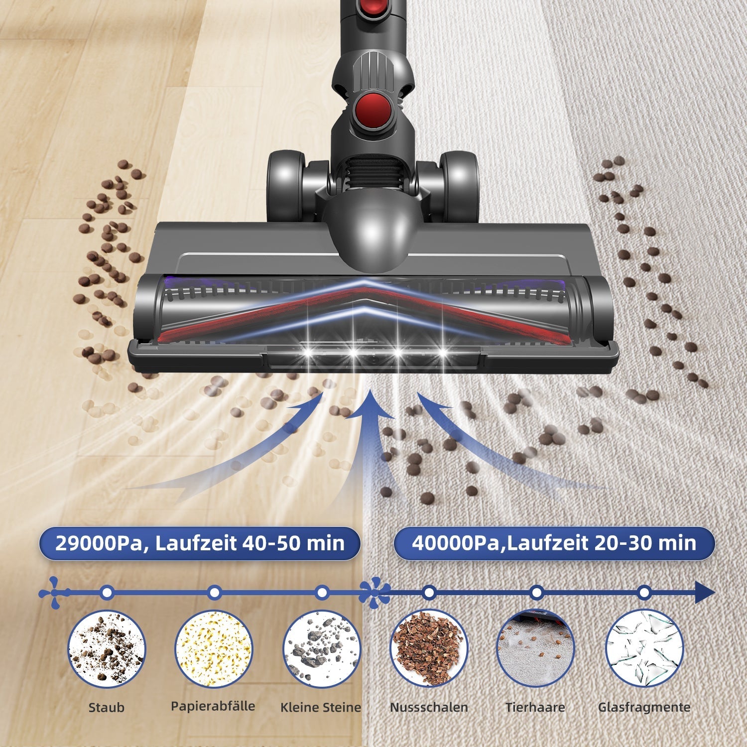 Der Akku Staubsauger verwendet einen 550W-bürstenlose Hochleistungsmotor,der sicherstellt, dass der akkustaubsauger stabilere 55000Pa Saugleistung, längere Lebensdauer und geringeren Geräuschpegel bietet. Mit einer starken Saugleistung von 55 kPa imax modus saugt der staubsauger kabellos mühelos Staub, Krümel,Tierhaare und Schmutz auf und reinigt mühelos Hartböden, Fliesen, Teppiche und Hartholzböden, und Ihr Zuhause erstrahlt in neuem Glanz.