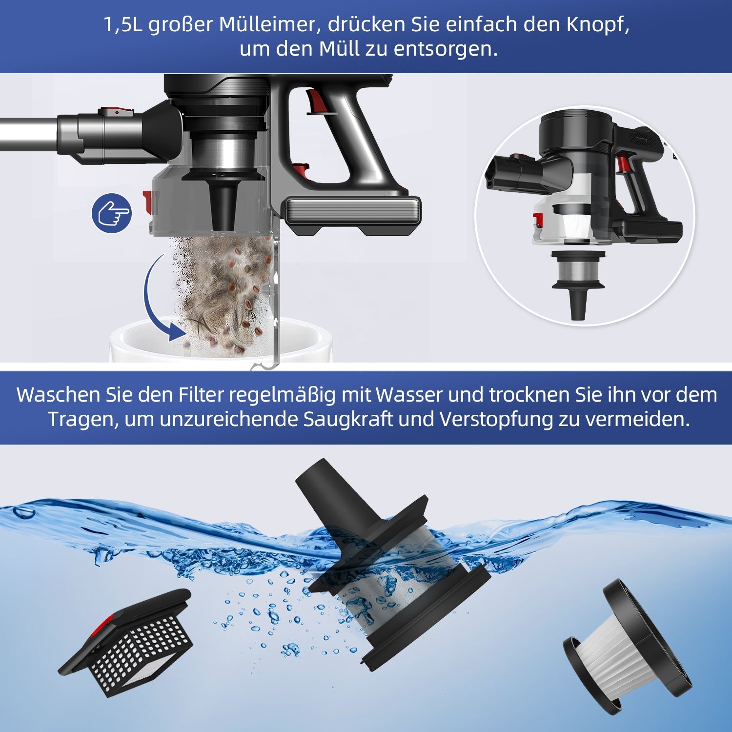 Dieser staubsauger kabellos verwendet einen austauschbaren Hochleistungs-Lithium-Akku und ist mit einem 25200mAh 7-Zellen-Akku mit großer Kapazität ausgestattet. Im Max Modus kann der Akku Staubsauger 30 Minuten lang ununterbrochen arbeiten. Im Standardmodus kann der Staubsauger 50 Minuten durchgängig arbeiten und ist in nur 4-5 Stunden vollständig aufgeladen. Das bedeutet, dass Sie das ganze Haus in einem Durchgang gründlich reinigen können. Ersatzbatterien sind bei OTTO erhältlich.