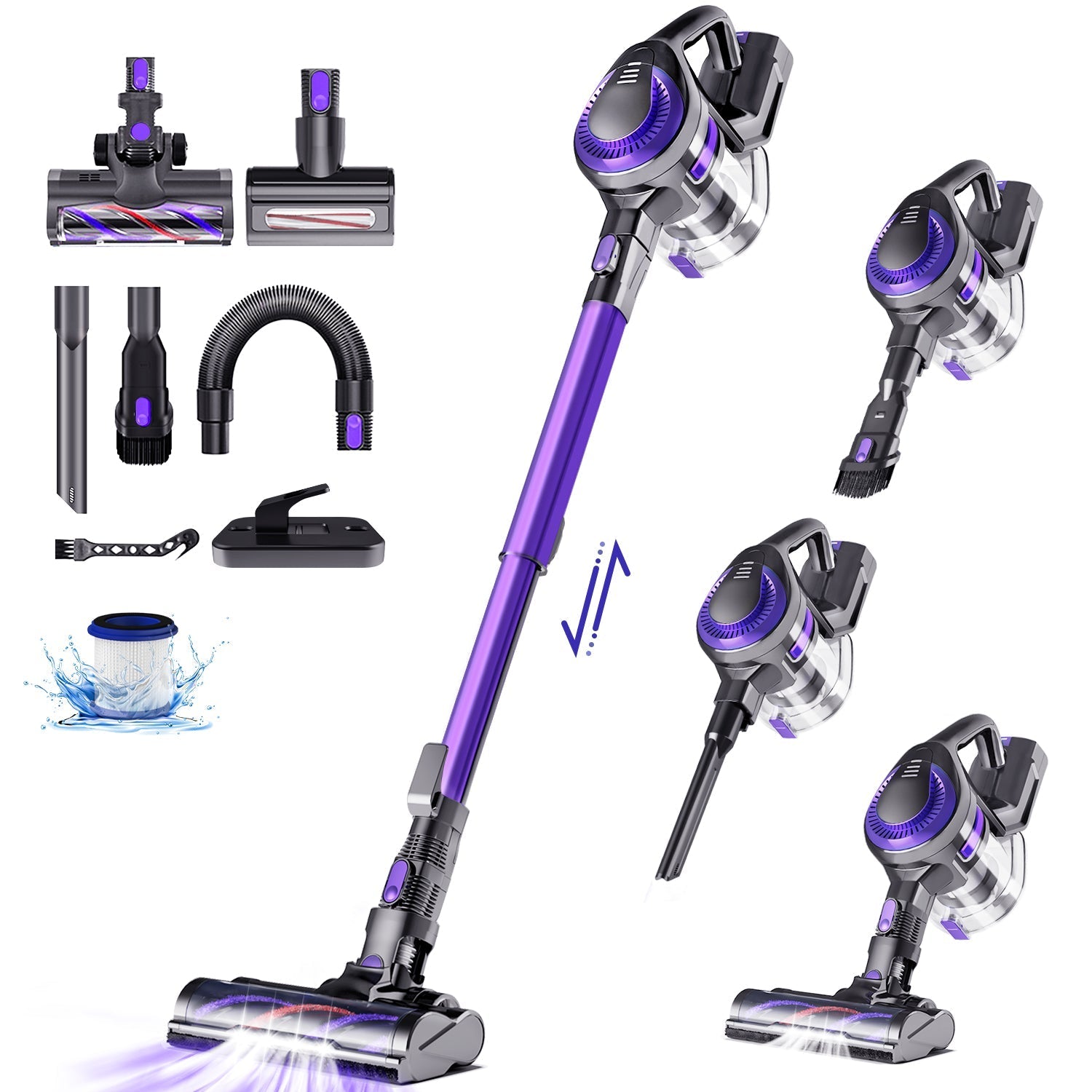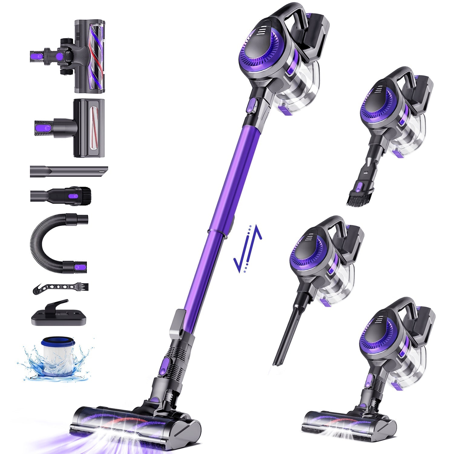 - Der kabellose Staubsauger verfügt über eine V-förmige Anti-Verwicklungs-Bürste, einen flexiblen Bürstenkopf und einen LED-Scheinwerfer für mühelose Reinigung, auch in Ecken.
