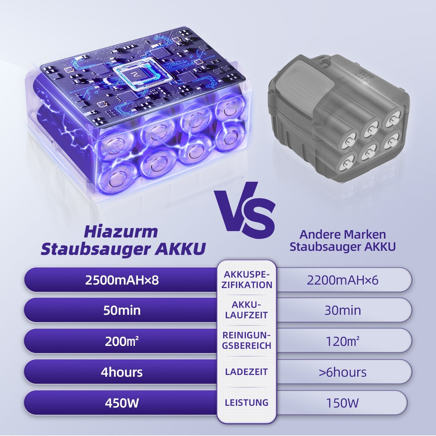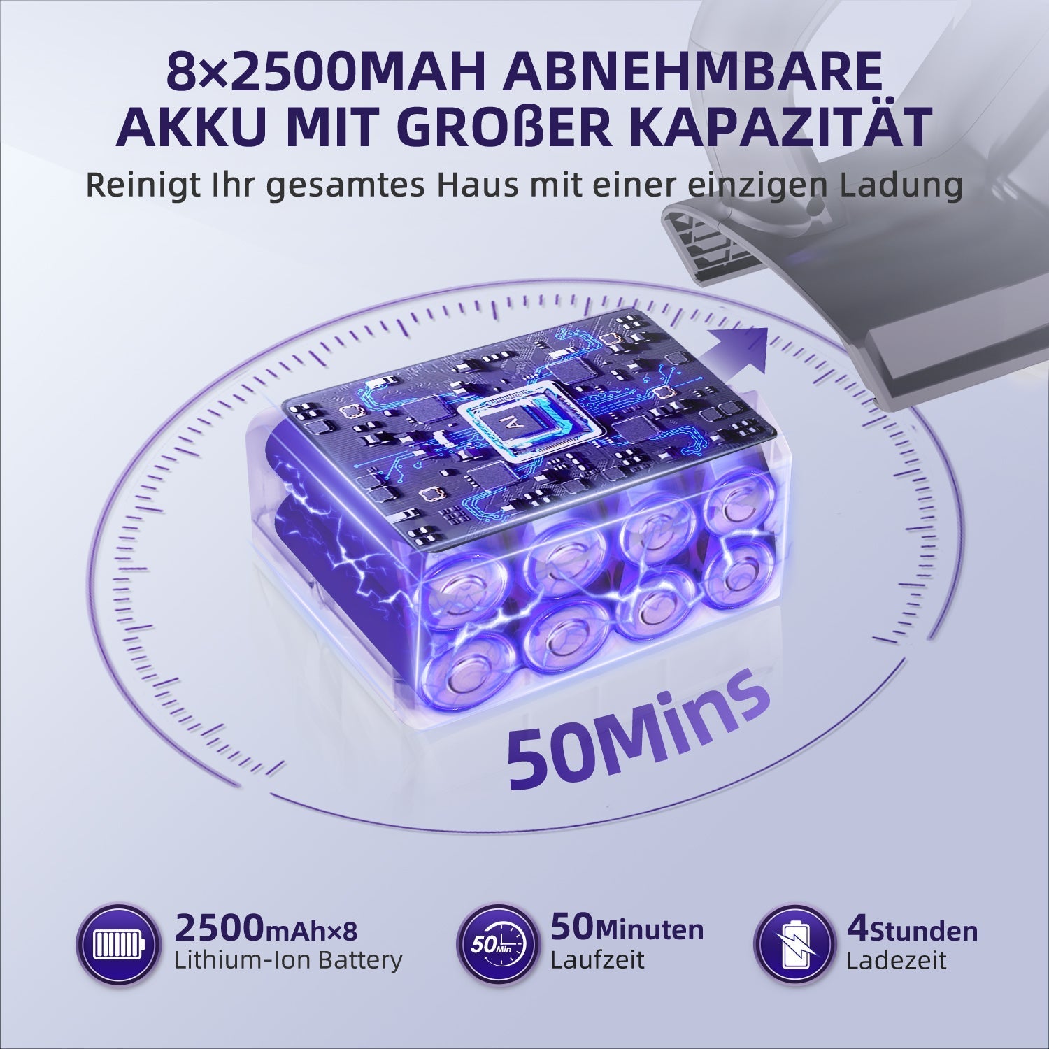 Der leistungsstarke Staubsauger ist mit einem 8-Zellen 2500mAh Hochdichte-Lithium-Akku ausgestattet, der zusammen mit einem intelligenten Energiemanagementsystem eine Laufzeit von bis zu 50 Minuten bei voller Ladung ermöglicht. Die Ladezeit beträgt nur 4 Stunden. Der Akku ist abnehmbar, was den Austausch und die Wartung erleichtert und die Lebensdauer des Geräts verlängert. Außerdem verfügt der Staubsauger über zwei Saugstärkestufen: Die niedrige Stufe eignet sich für den täglichen Staub, während die hohe Stufe hartnäckige Verschmutzungen entfernt, um den Anforderungen verschiedener Reinigungsumgebungen gerecht zu werden.