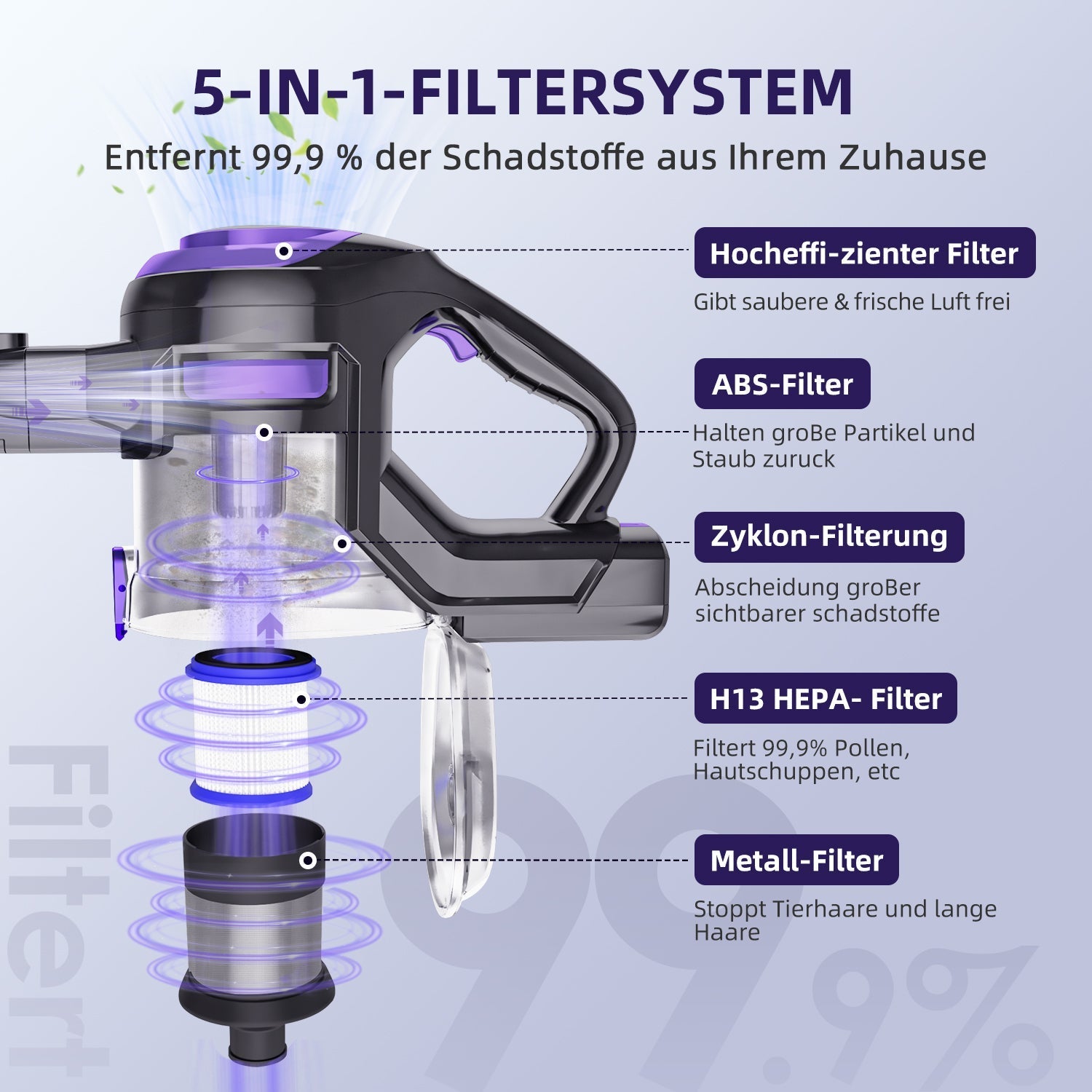 Der Staubsauger sorgt mit seinem durchdachten Design für ein sauberes und frisches Erlebnis. Das 7-stufige HEPA-Filtersystem filtert effektiv 99,99 % des Feinstaubs, Pollen, Hausstaubmilben und andere Allergene bis zu einer Größe von 0,3 Mikrometern. Dies macht ihn besonders geeignet für Haushalte mit Babys, älteren Menschen oder Allergikern. Der Staubsauger ist zudem mit einem 1,6 l großen Staubbehälter ausgestattet, der über eine praktische One-Touch-Öffnung verfügt, um Staub einfach und mühelos zu entleeren, wodurch die Häufigkeit des Entleerens verringert wird. Das vollständig versiegelte Luftkanalsystem verhindert effektiv das Austreten von Staub.