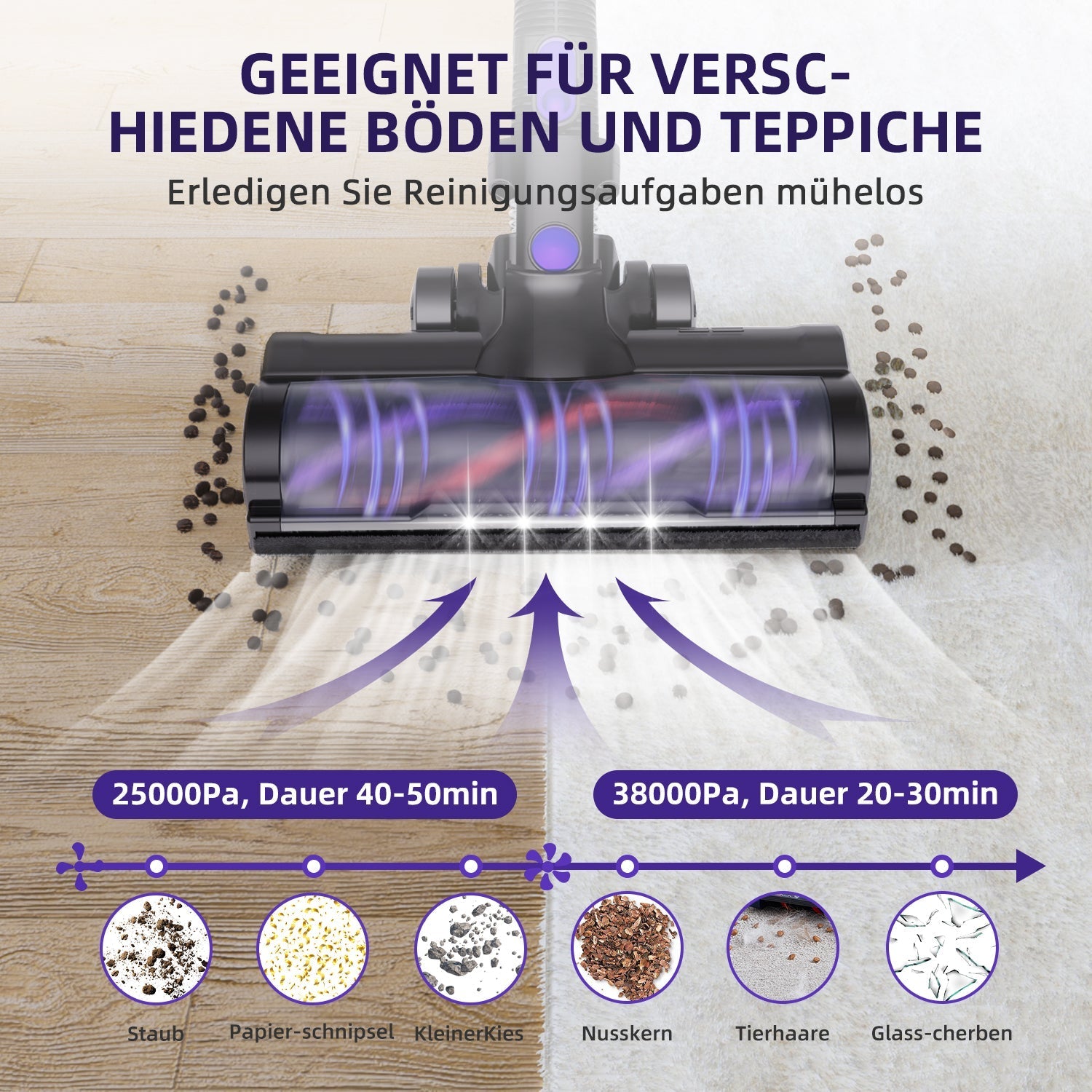 - Kabelloser Staubsauger mit bürstenlosem Motor und Doppel-Turbo-Technologie bietet 60.000Pa Saugleistung. Er reinigt gründlich auf Teppichen und bei Tierhaaren.