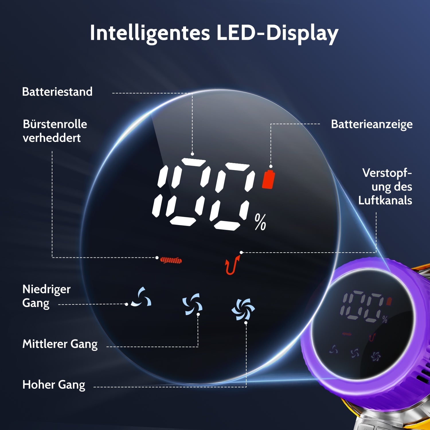- Das smarte Display überwacht den Akkustand, warnt bei Blockierungen und passt den Saugmodus an – für eine effizientere und bequemere Reinigung.