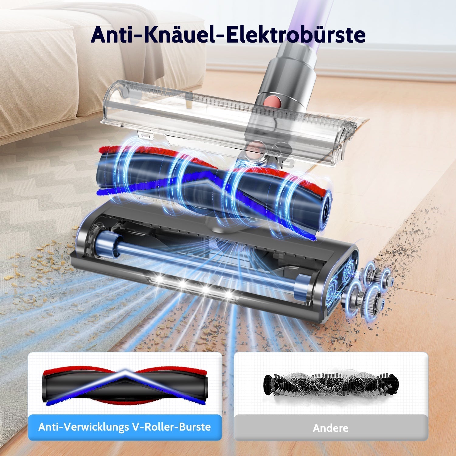 Dieser kabellose Staubsauger verfügt über eine innovative Anti-Verwicklungs-Bodendüse, die speziell entwickelt wurde, um Haarverwicklungen zu vermeiden und den Reinigungsprozess effizienter zu gestalten. Im Gegensatz zu herkömmlichen Bodendüsen, die bei langen Haaren oder Tierhaaren schnell verstopfen und die Saugkraft beeinträchtigen, nutzt diese Düse ein V-förmiges Borstendesign. Dadurch wird der Schmutz gezielt zur Saugöffnung geleitet, und das Ansaugen von Haaren und Staub wird optimiert. Dank dieser Technik wird selbst hartnäckiger Schmutz zuverlässig entfernt, was für eine reibungslose und gründliche Reinigung sorg.