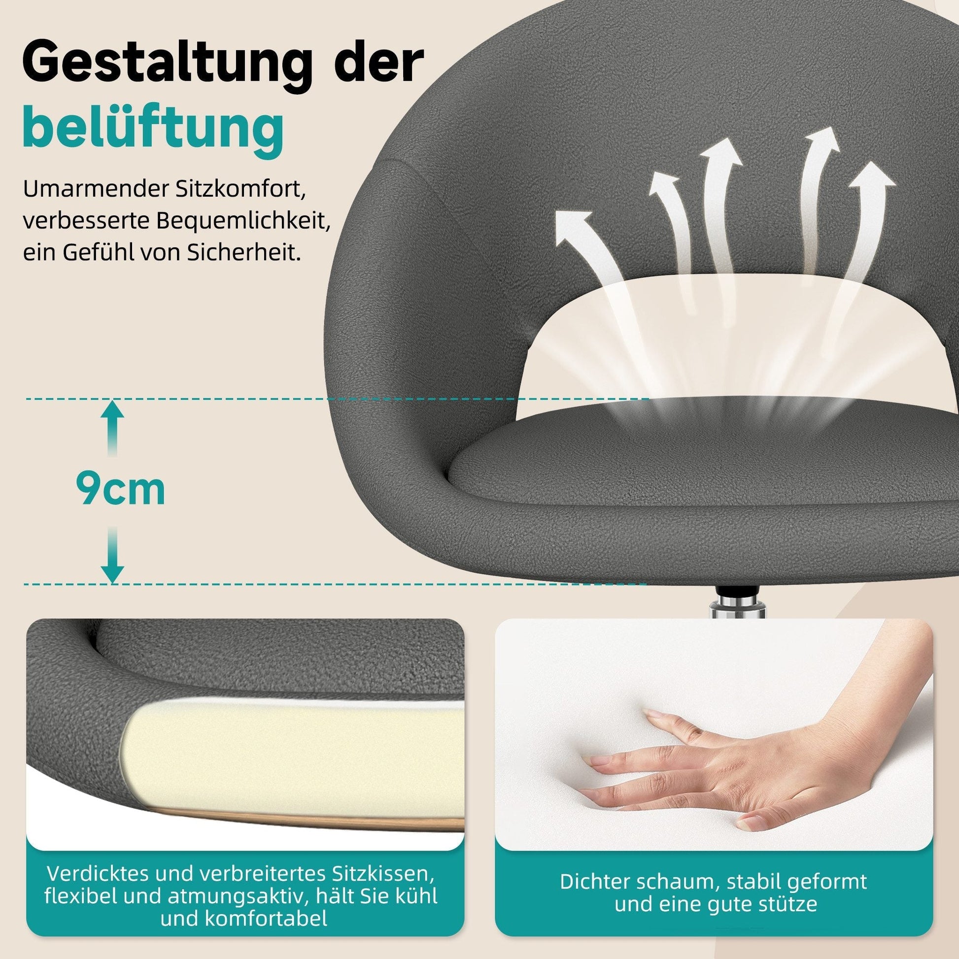 Dieser Drehstuhl ist von den flauschigen Wolken inspiriert und der plüschige Bezug aus Boucle-Gewebe sorgt für ein komfortables Sitzerlebnis,verleiht Ihrem Zuhause eine gemütliche Note. Dieser stilvolle Bürostuhl ist perfekt für Wohnzimmer, Schlafzimmer, Schminkraumoder jedes andere Dekor-Thema, kann auch als Schminkstuhl für Mädchen und Frauen verwendet werden.