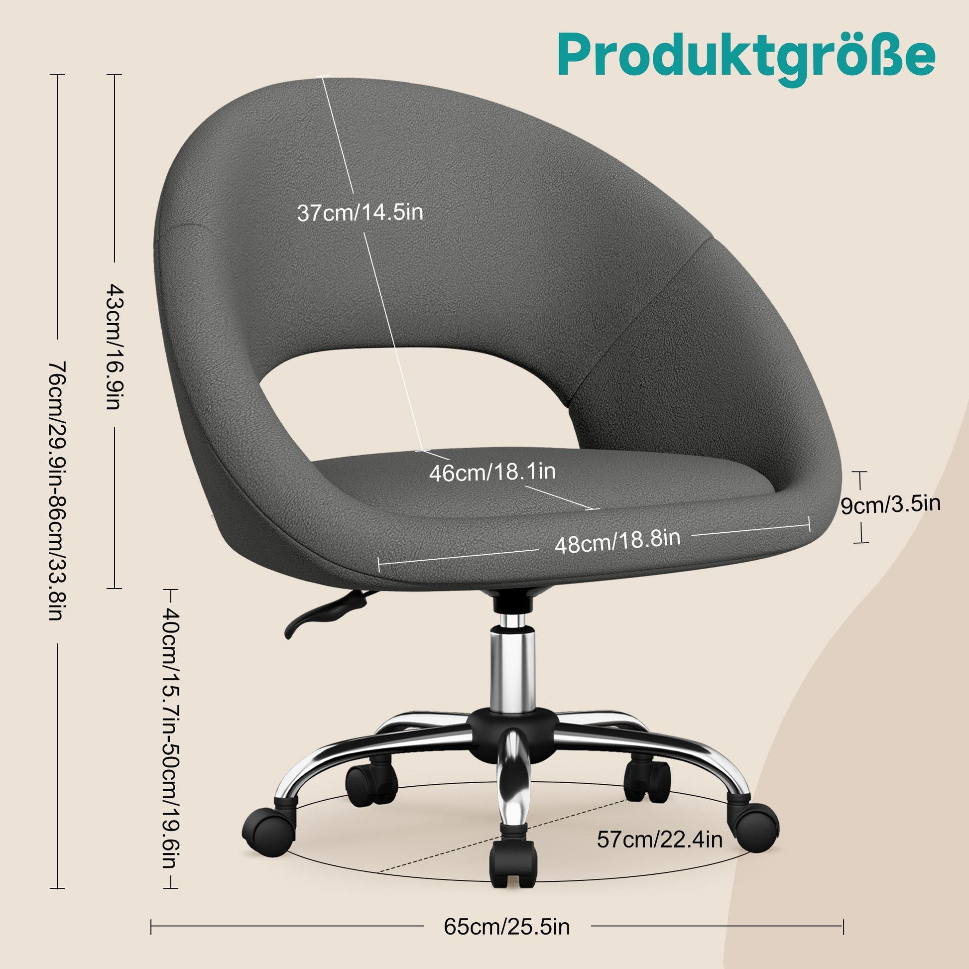 - Die Sitzhöhe ist verstellbar und durch den 360°-Drehfuß und die Rollen frei beweglich.