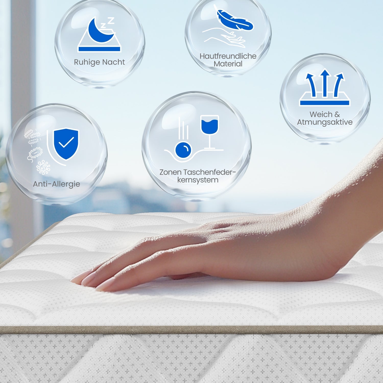 22 cm hoch, (9 Schichten hochwertiger Materialien, Taschenfederkernmatratze mit Atmungsaktive Bezug), Matratze für Kinder und Erwachsene